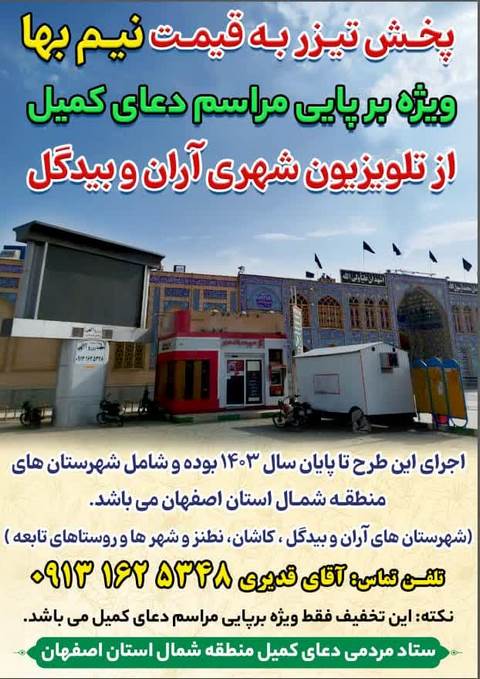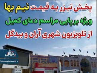 به گزارش خبرنگار طاووس بهشت؛ تیزر مراسم دعای کمیل از تلویزیون شهری آران و بیدگل به قیمت نیم بها پخش می شود.