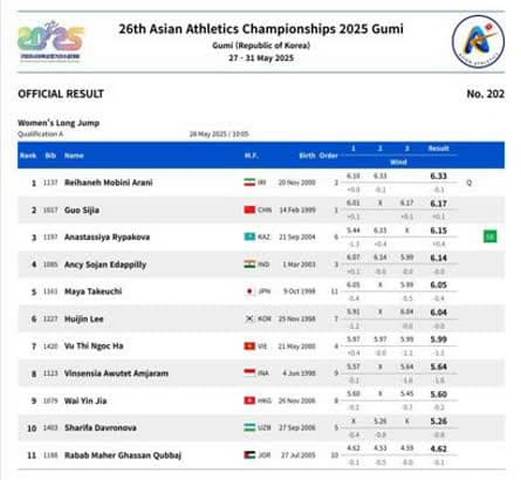ریحانه مبینی به مرحله نهایی پرش طول مسابقات دو و میدانی قهرمانی آسیا راه یافت.
