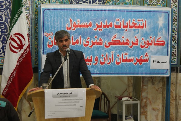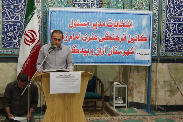 طاووس بهشت: گزارش تصویری از مجمع عمومی سالانه کانون فرهنگی هنری امام زمان (عج) که در28 اسفند ماه 93 در مسجد امام زمان(عج) برگزارشد. دراین مراسم اعضا کانون پس از استماع برنامه کاندیداهای پذیرش مدیر مسؤلی کانون فرهنگی هنری امام زمان(عج) ،از بین آقایان مانده علی رهی ،امیر بستان پیراو مهدی رحمتی ، بااکثریت آرا آقای مانده علی رهی  را به مدت یکسال به عنوان مدیر مسؤل جدید کانون فرهنگی هنری امام زمان(عج) شهرستان آران وبیدگل  انتخاب کردند. عکس از: حسن رحمتی