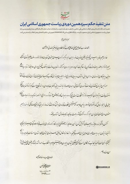 حکم تنفیذ سیزدهمین دوره ریاست جمهوری اسلامی ایران به شرح ذیل می باشد: