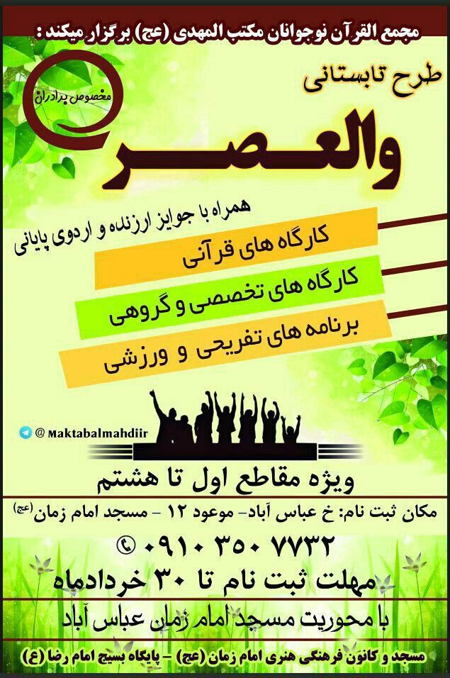 به گزارش خبرنگار طاووس بهشت؛ همزمان با شروع فصل تابستان، مجمع القرآن نوجوانان مکتب المهدی(عج) کانون فرهنگی هنری امام زمان (عج) عباس آباد شهرستان آران بیدگل اقدام به برگزاری کلاس های تابستانی برای کودکان و نوجوانان نموده است. اطلاعات بیشتر در پوستر ذیل ارایه گردیده است.