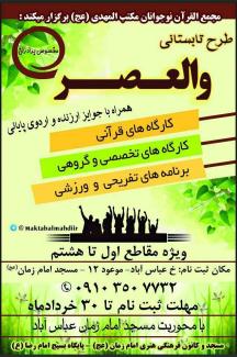 <p>به گزارش خبرنگار <strong>طاووس بهشت</strong>؛ همزمان با شروع فصل تابستان، مجمع القرآن نوجوانان مکتب المهدی(عج) کانون فرهنگی هنری امام زمان (عج) عباس آباد شهرستان آران بیدگل اقدام به برگزاری کلاس های تابستانی برای کودکان و نوجوانان نموده است. اطلاعات بیشتر در پوستر ذیل ارایه گردیده است.</p>