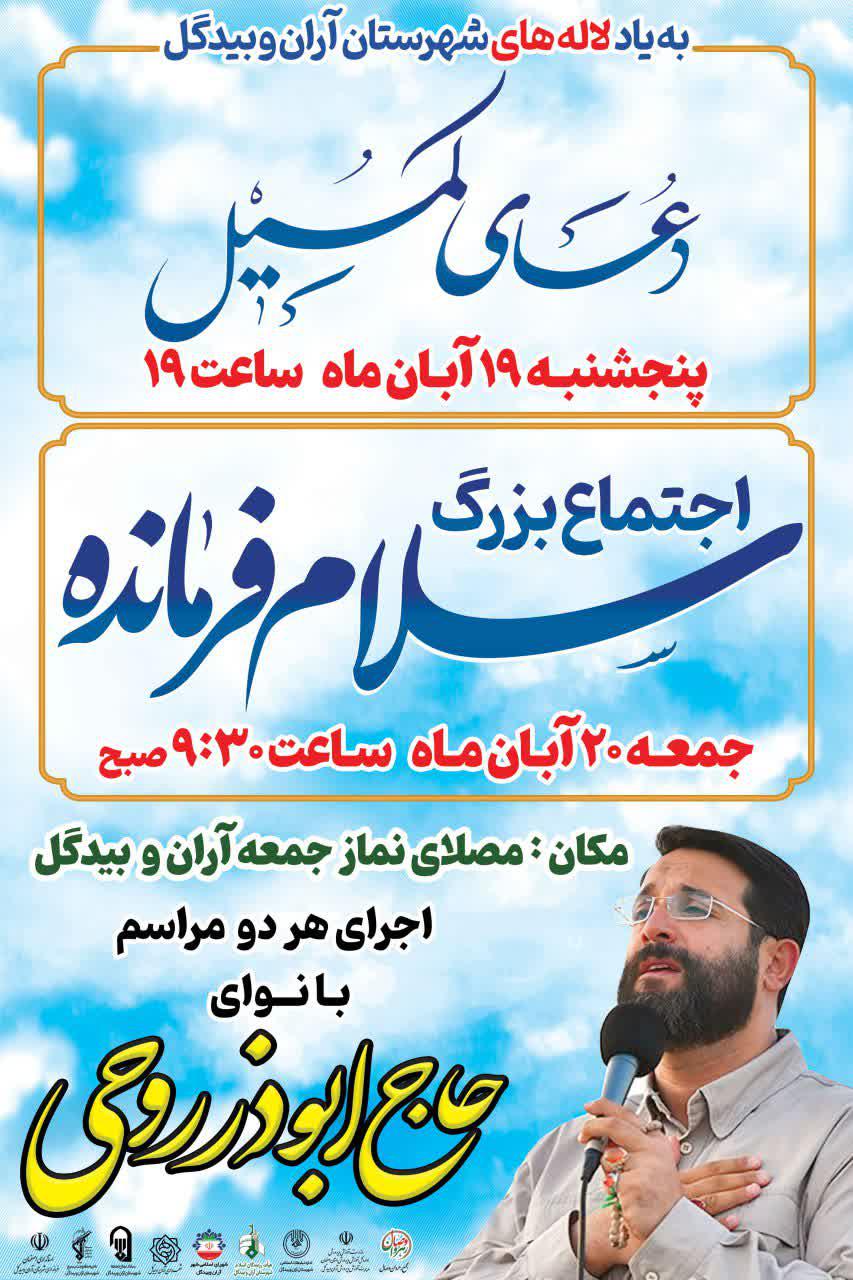 محمدی ادامه داد: همچنین مراسم روح بخش دعای کمیل با مناجات خوانی ابوذر روحی، پنج شنبه ۱۹ آبان از ساعت ۱۹ در مصلای نماز جمعه آران و بیدگل برگزار خواهد شد.