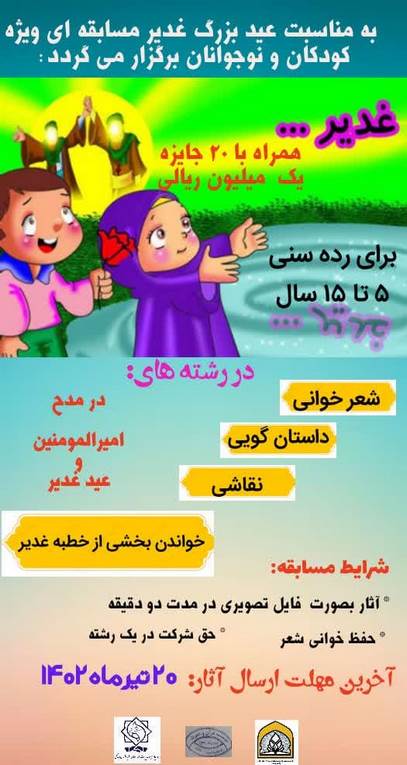 موسسه قرآن و عترت امام زمان(عج) شهرستان آران و بیدگل با همکاری معاونت خواهران کانون فرهنگی- هنری امام زمان(عج) و مردمیاری و مدیریت محله عباس آباد، به مناسبت عید بزرگ غدیر مسابقه برگزار می کند.
