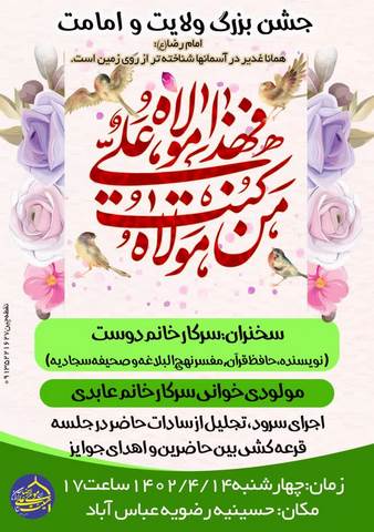 به گزارش خبرنگار طاووس بهشت؛واحد خواهران هیأت علی بن موسی الرضا (ع)جشن بزرگ ولایت و امامت همراه باسخنرانی سرکار خانم دوست (نویسنده، حافظ قرآن، مفسر نهجالبلاغه و صحیفه سجادیه)و مولودی خوانی سرکار خانم عابدی و اجرای سرود و تجلیل از سادات حاضر در جلسه برگزار می کند.