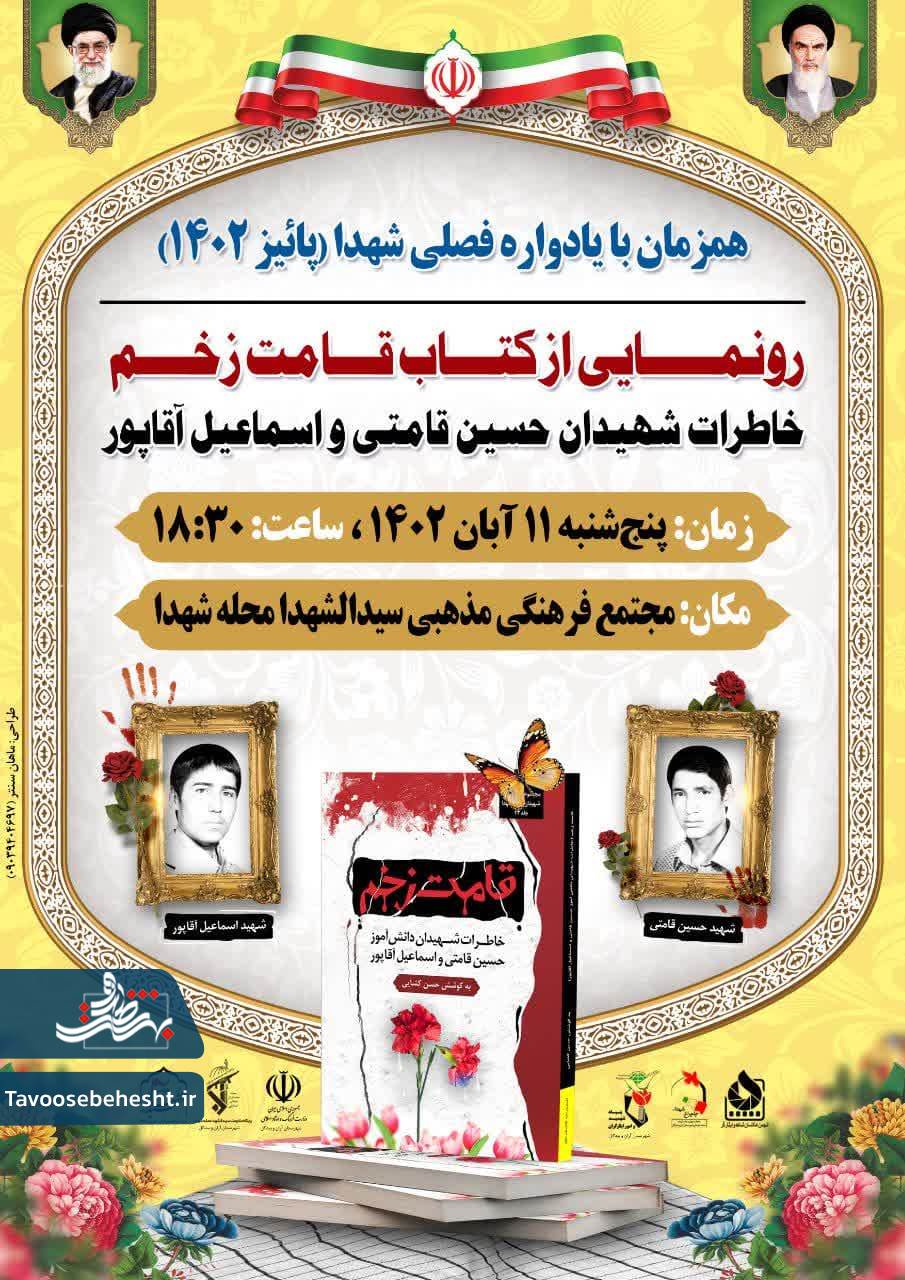 رونمایی از کتاب "قامت زخم" شامل مجموعه خاطرات دو شهید دانش آموز؛ به مناسبت روز دانش آموز رونمایی می شود.