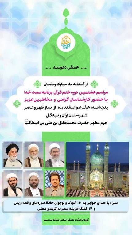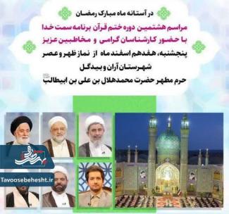 مراسم هشتمین دوره ختم قرآن برنامه سمت خدا با حضور کارشناسان برنامه در حرم مطهر حضرت محمدهلال بن علی(ع) برگزار میشود.