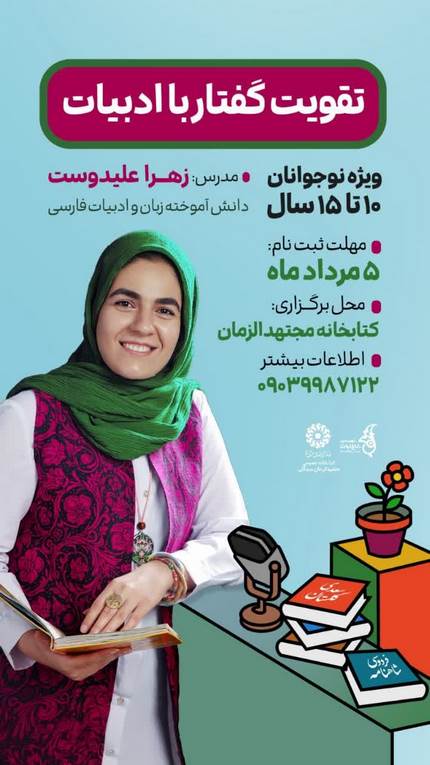 به گزارش خبرنگار طاووس بهشت؛ کتابخانه عمومی مجتهدالزمان بیدگلی با همکاری انجمن ادبی شاخ نبات دوره «تقویت گفتار با ادبیات» ویژه نوجوانان ۱۰ تا ۱۵ سال با تدریس زهرا علیدوست؛دانش آموخته زبان و ادبیات فارسی برگزار می کند.