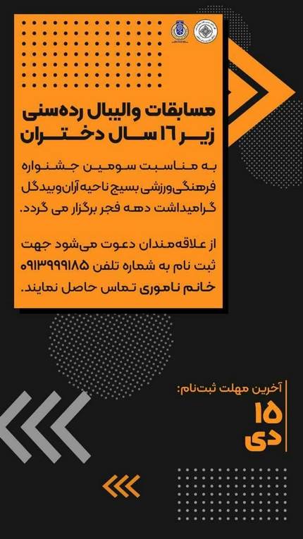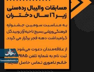 به مناسبت سومین جشنواره فرهنگی_ورزشی بسیج ناحیه آران و بیدگل " گرامیداشت دهه فجر" هیات والیبال این شهرستان مسابقات والیبال ویژه دختران برگزار می کند.