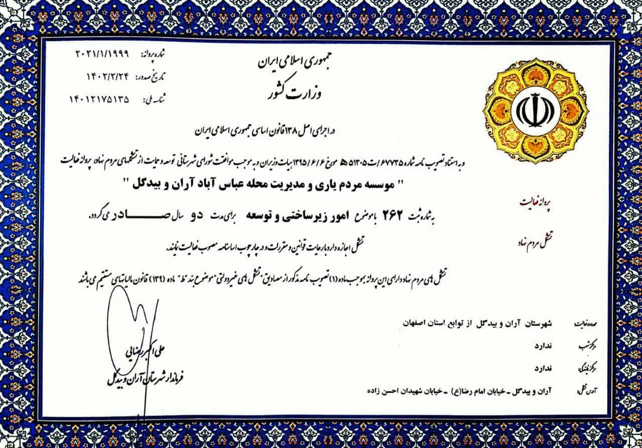 به گزارش خبرنگار طاووس بهشت؛پروانه فعالیت مردمیاری و مدیریت محله عباس آباد آران و بیدگل صادر شد. این خبر خوبی بود که در رسانه ها منتشر شد. مردمیاری محله عباس آباد نهاد مردمی است که با هدف بهره گیری از اندیشه، تخصص و تجربه شهروندان در اداره امور محله، جلب مشارکت معتمدین و ساکنین و همچنین واگذاری امور محله به خود مردم در سال ۱۳۹۶ تاسیس شد.