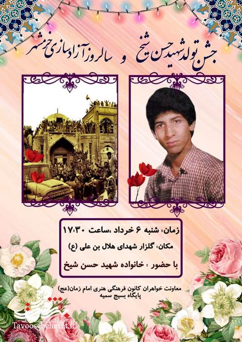 به گزار خبرنگار طاووس بهشت؛ جشن تولد شهید "حسن شیخ "همراه با بزرگداشت سالروز آزادسازی خرمشهر با حضور خانواده شهیدبرگزار می شود.
