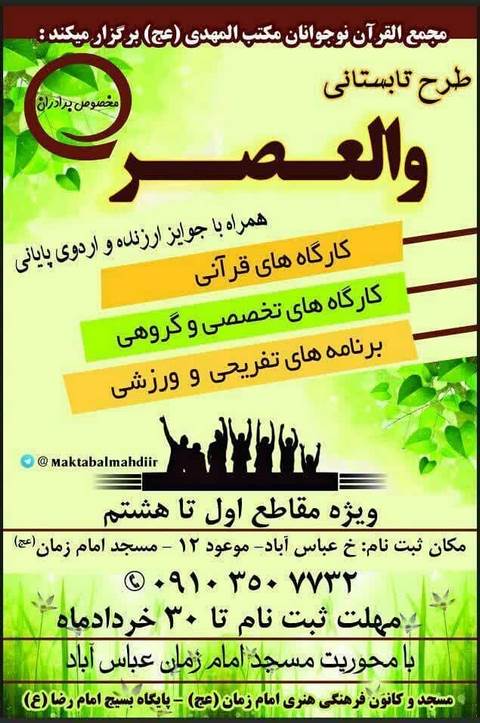 مجمع القرآن نوجوانان مکتب المهدی طرح تابستانی والعصر با محوریت مسجد برگزار می کند.