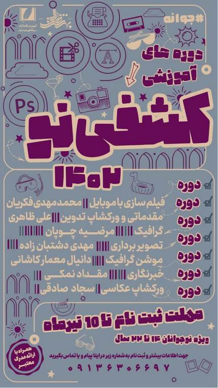 به گزارش خبرنگار طاووس بهشت؛ دوره های آموزشی "کشفی نو" برگزار می شوداین دوره شامل فیلم سازی با موبایل، مقدماتی و ورکشاپ تدوین،گرافیک،تصویربرداری، موشن گرافیک، خبرنگاری و ورکشاپ عکاسی می باشد.این دوره ها بصورت حضوری ویژه نوجوانان ۱۴ تا ۲۲ سال برگزار می شود.