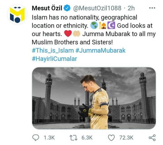 مسوت اوزیل ستاره ترک تبار مسلمان آلمانی در توئیتی با تصویر نمای حرم مطهر حضرت محمدهلال بن علی(ع) نوشت: اسلام، هیچ ملیت موقعیت جغرافیایی و قومی ندارد؛ خدا به قلب ما نگاه می کند.