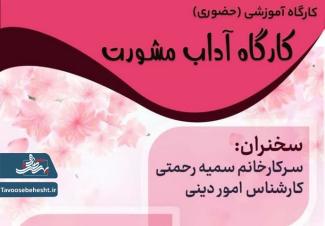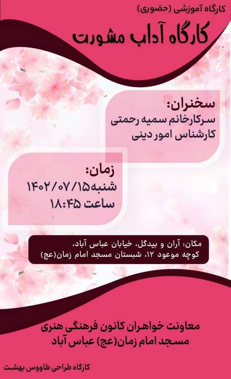 کارگاه آداب مشورت با سخنرانی سرکار خانم سمیه رحمتی، کارشناس امور دینی به همت معاونت خواهران کانون فرهنگی هنری مسجد امام زمان(عج) برگزار می شود.