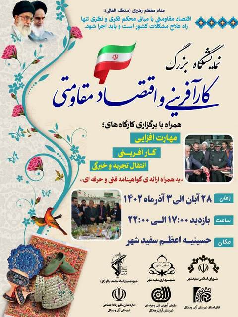 نمایشگاه بزرگ کارآفرینی و اقتصاد مقاومتی همزمان با هفته کارآفرینی و گرامیداشت هفته بسیج کارگاه های ویژه عموم مردم همراه با ارائه "گواهینامه فنی و حرفه ای" برگزار می گردد.