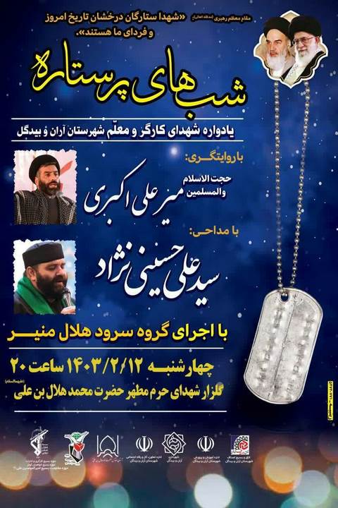 عبدالله آبادی در پایان گفت: سخنران مراسم یادواره شهدای کارگر و معلم شهرستان آران و بیدگل، حجت الاسلام والمسلمین میر علی اکبری از راویان دفاع مقدس و مداح این محفل نورانی سید علی حسینی نژاد خواهند بود.