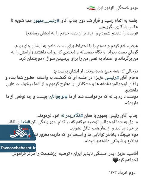 به گزارش خبرنگار طاووس بهشت؛ مرد خستگی ناپذیر ایران شهید جمهور آیت الله دکتر سید ابراهیم رییسی در جمع نوجوانان به آنان توصیه کردند./عکس: طاووس بهشت